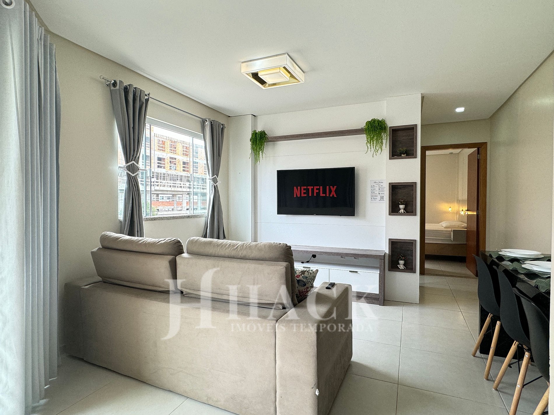 ◘ Living room integrated with the kitchen, featuring a 50" Smart TV and a comfortable sofa — perfect for leisure and relaxation.