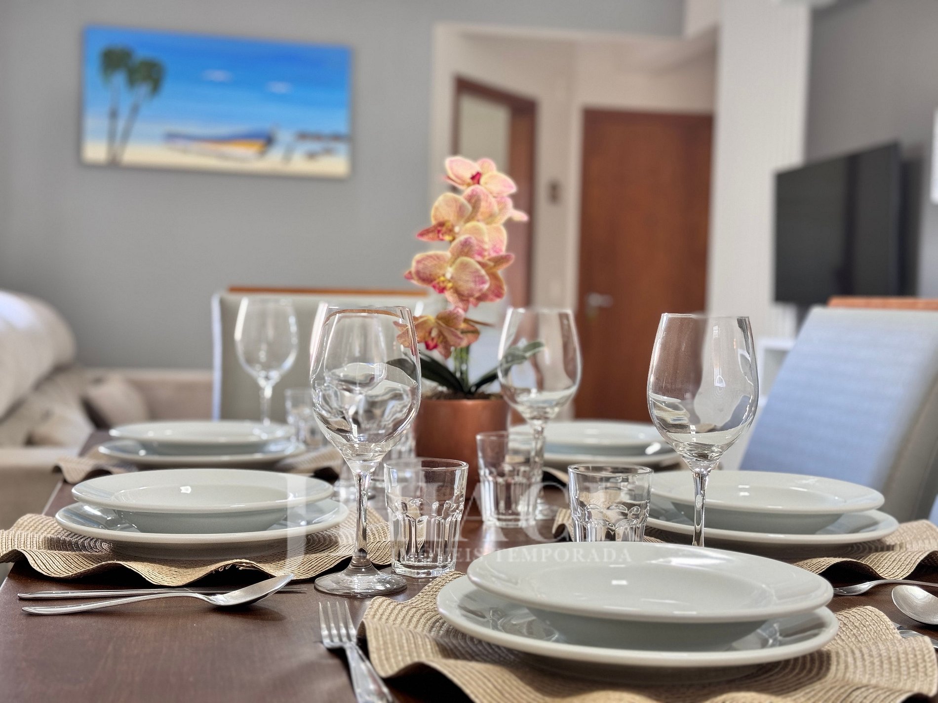 ◘ The living room, integrated with the kitchen, is extremely cozy and equipped with a 3-meter retractable and reclining sofa, perfect for relaxation. Although the apartment doesn’t have a balcony, the large window in the living room faces the sea, allowing the space to stay well-ventilated, with a light sea breeze providing a constant feeling of freshness. Additionally, a 43" Smart TV complements the space, making it ideal for leisure and relaxation.
