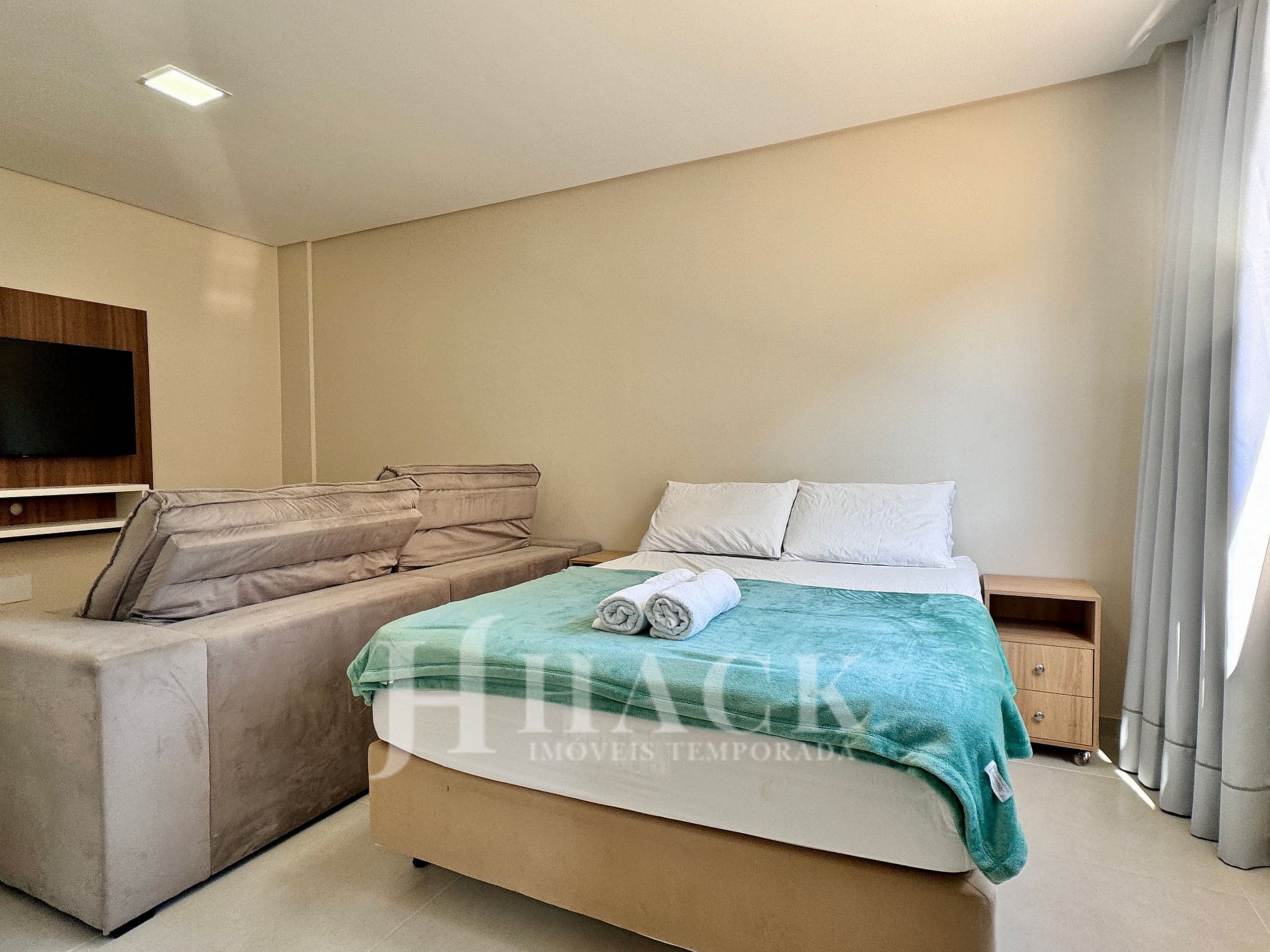 ◘ La sala de estar está integrada con la cocina y cuenta con una cama box de matrimonio, un Smart TV de 32'' y un sofá cómodo.