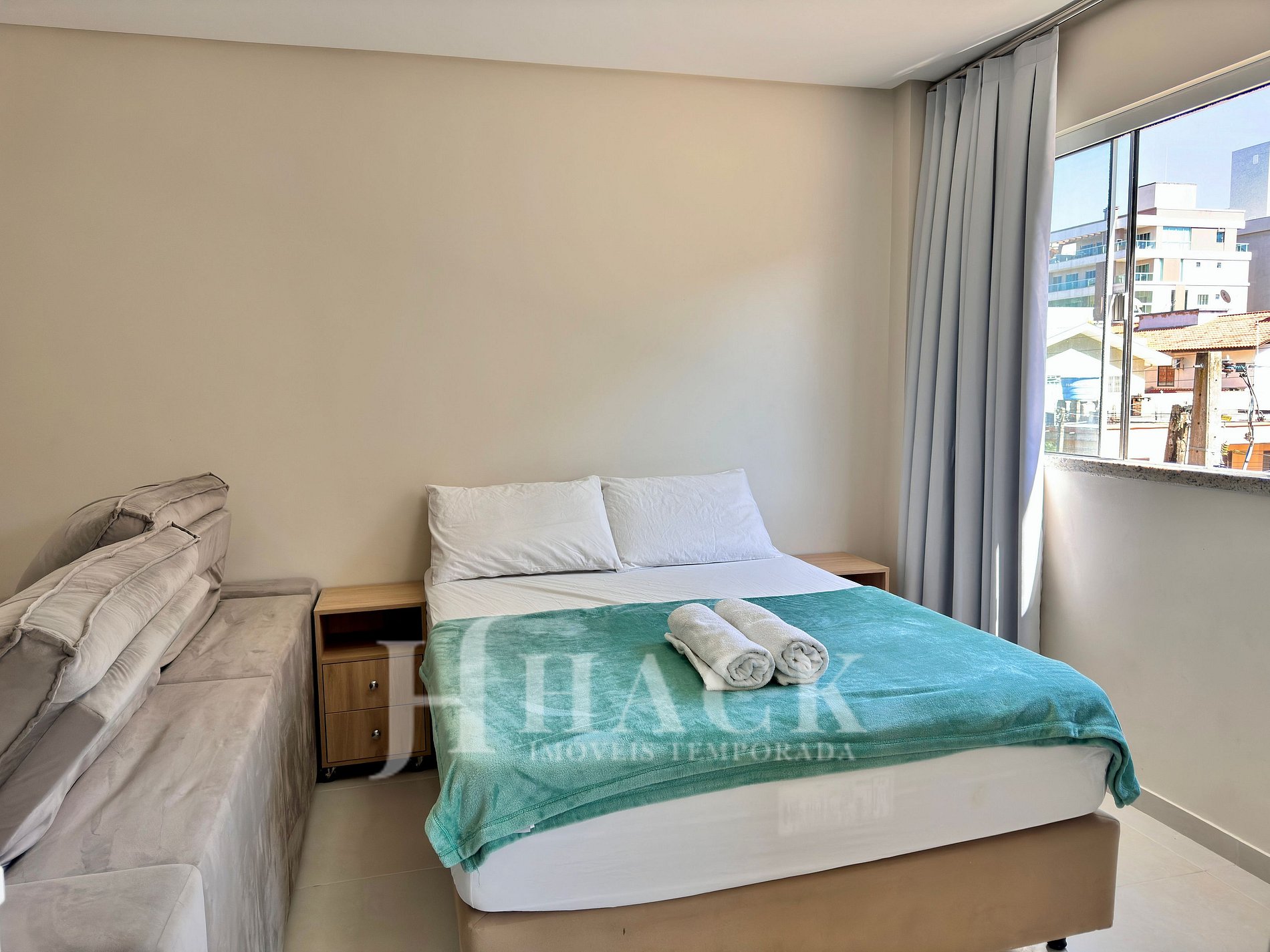 ◘ La sala de estar está integrada con la cocina y cuenta con una cama box de matrimonio, un Smart TV de 32'' y un sofá cómodo.