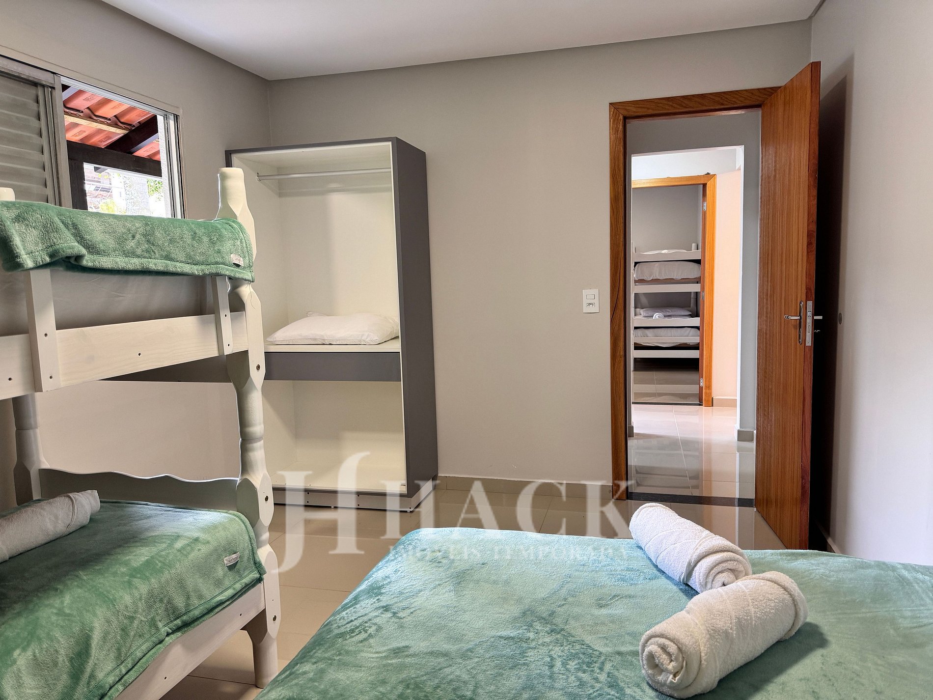 • 02 habitaciones en la parte frontal de la casa. 01 cama matrimonial y 01 cucheta individual en cada una de esas dos habitaciones.