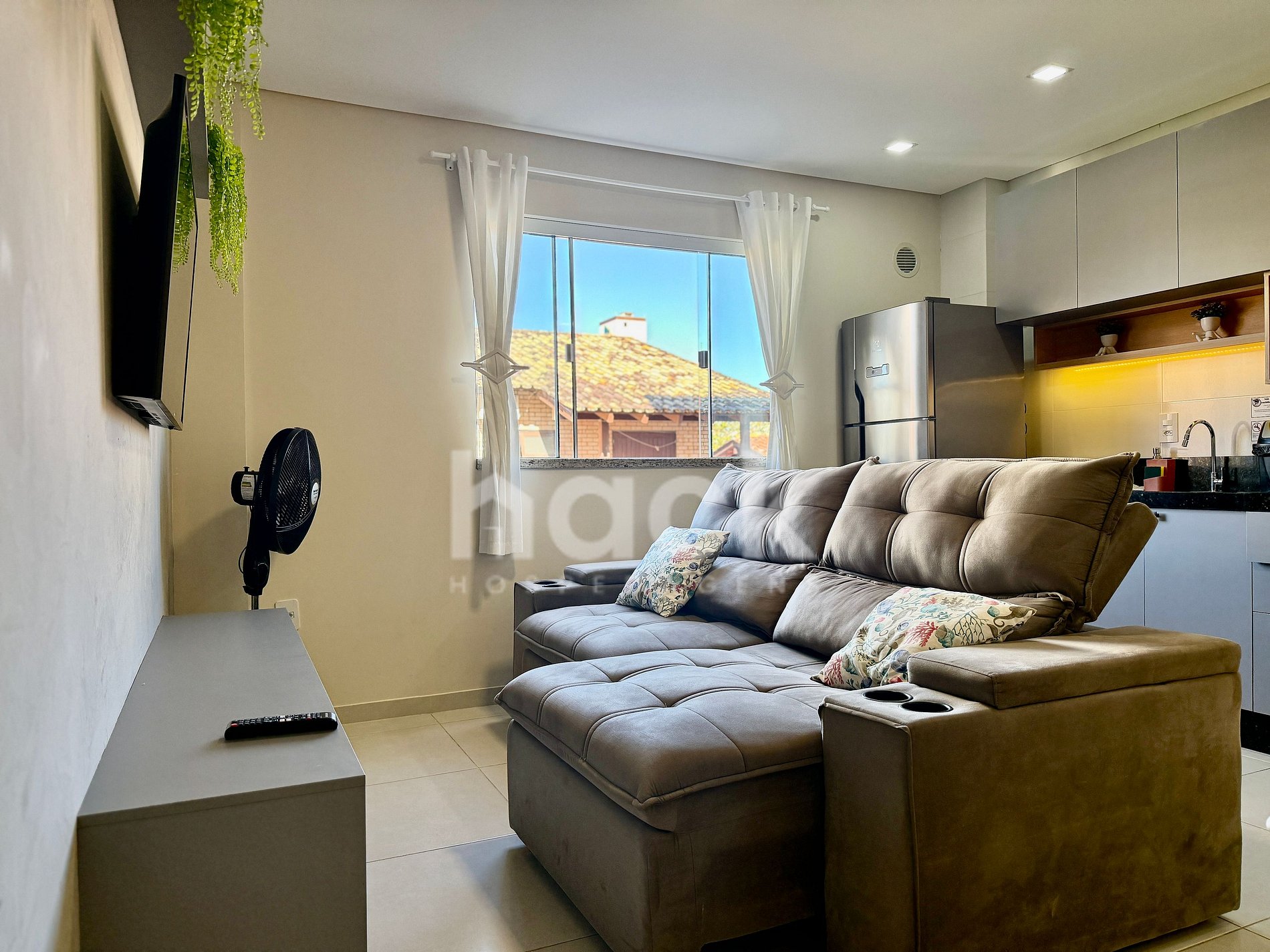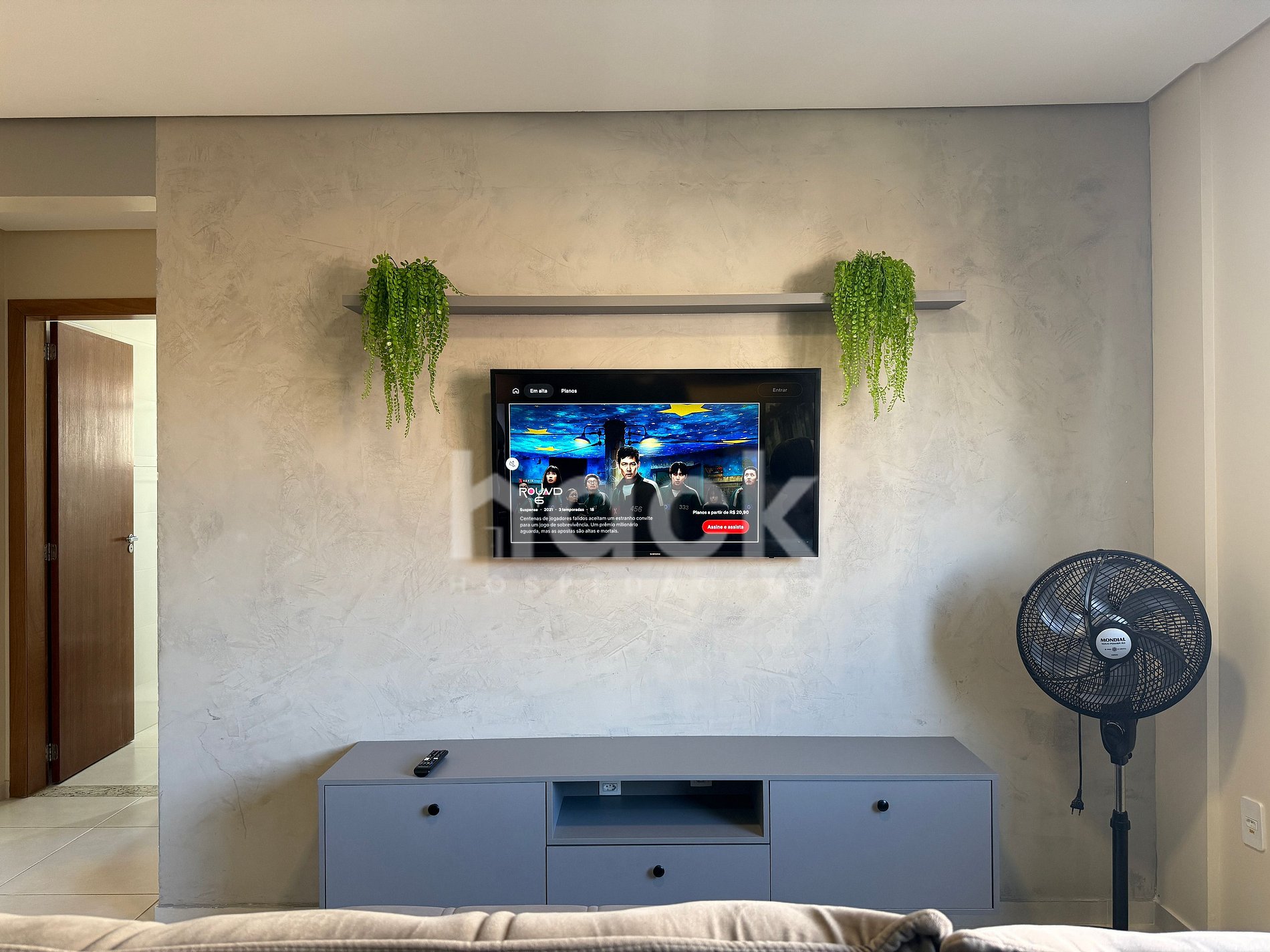 ◘ Relaxe na sala de estar integrada à cozinha, que possui uma Smart TV de 43'' e um confortável sofá. Um ventilador garante a circulação de ar fresco no ambiente.