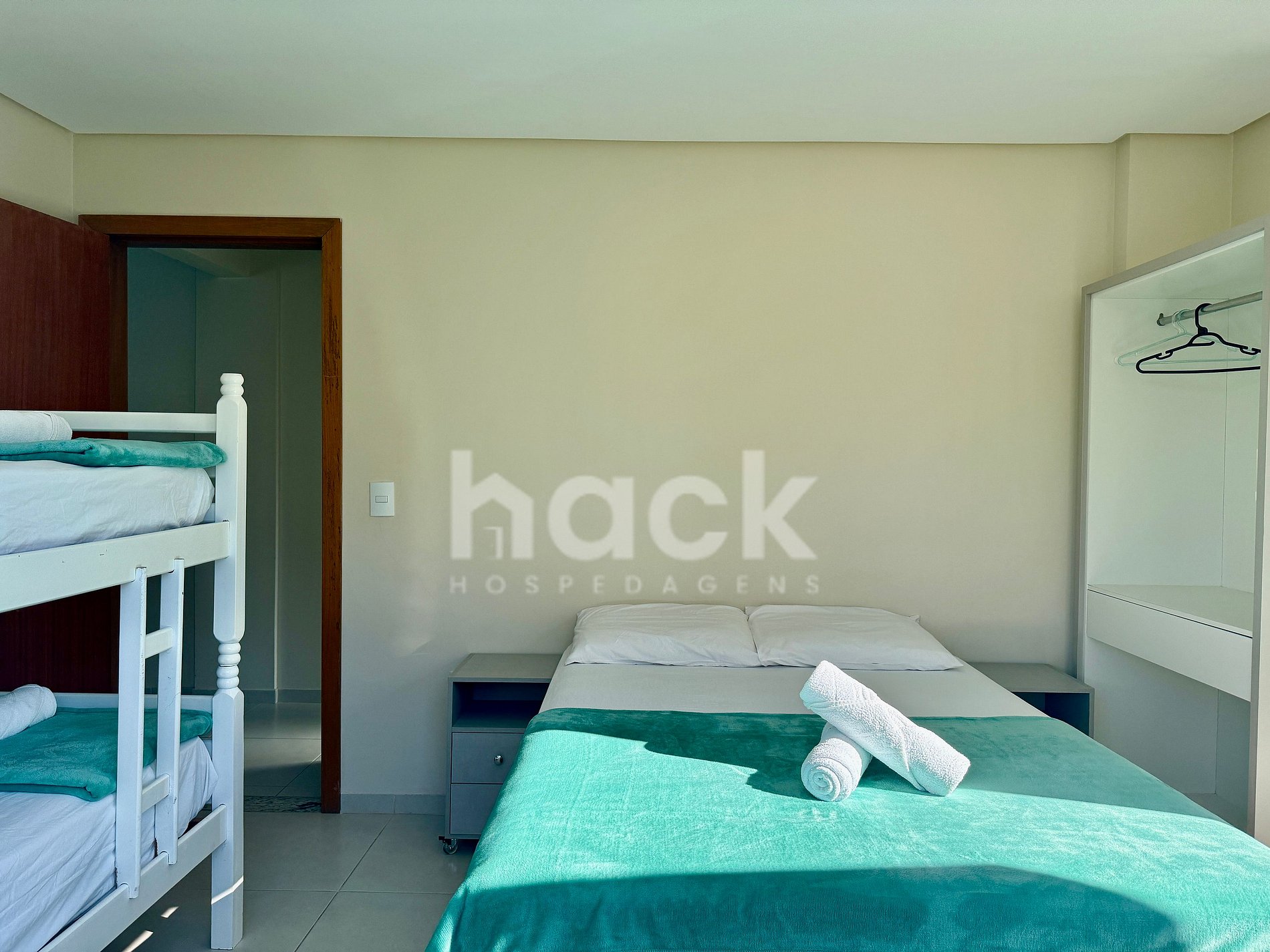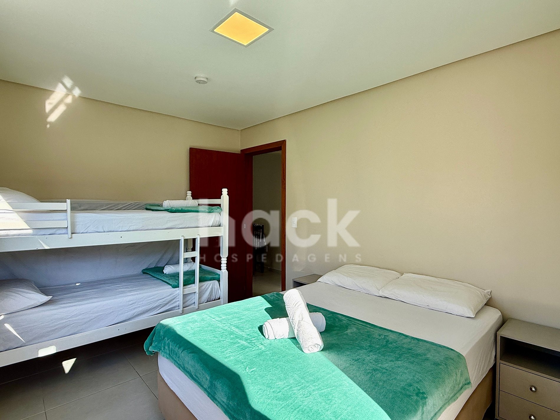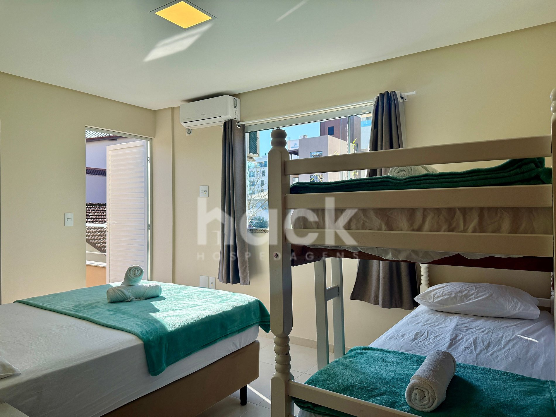 ◘ Descanse em um quarto acolhedor equipado com uma cama de casal queen de alta qualidade e uma beliche para 2 pessoas, acomodando até 4 pessoas confortavelmente. O dormitório também conta com um ar-condicionado SPLIT, garantindo noites frescas e agradáveis, além disso, oferece acesso a um terraço lateral, perfeito para momentos de tranquilidade ao ar livre.