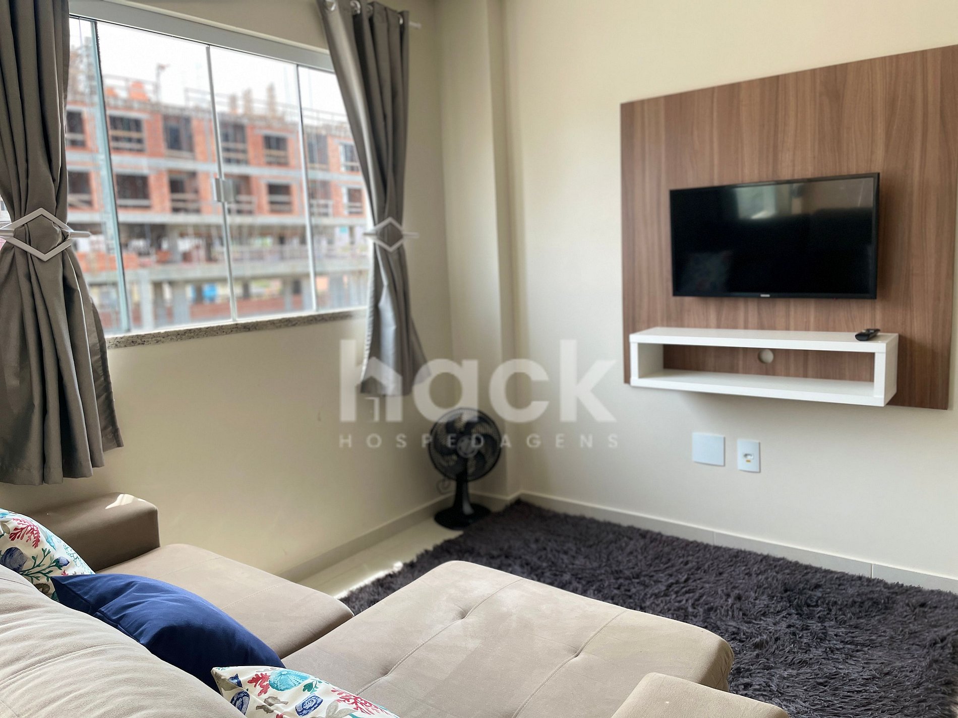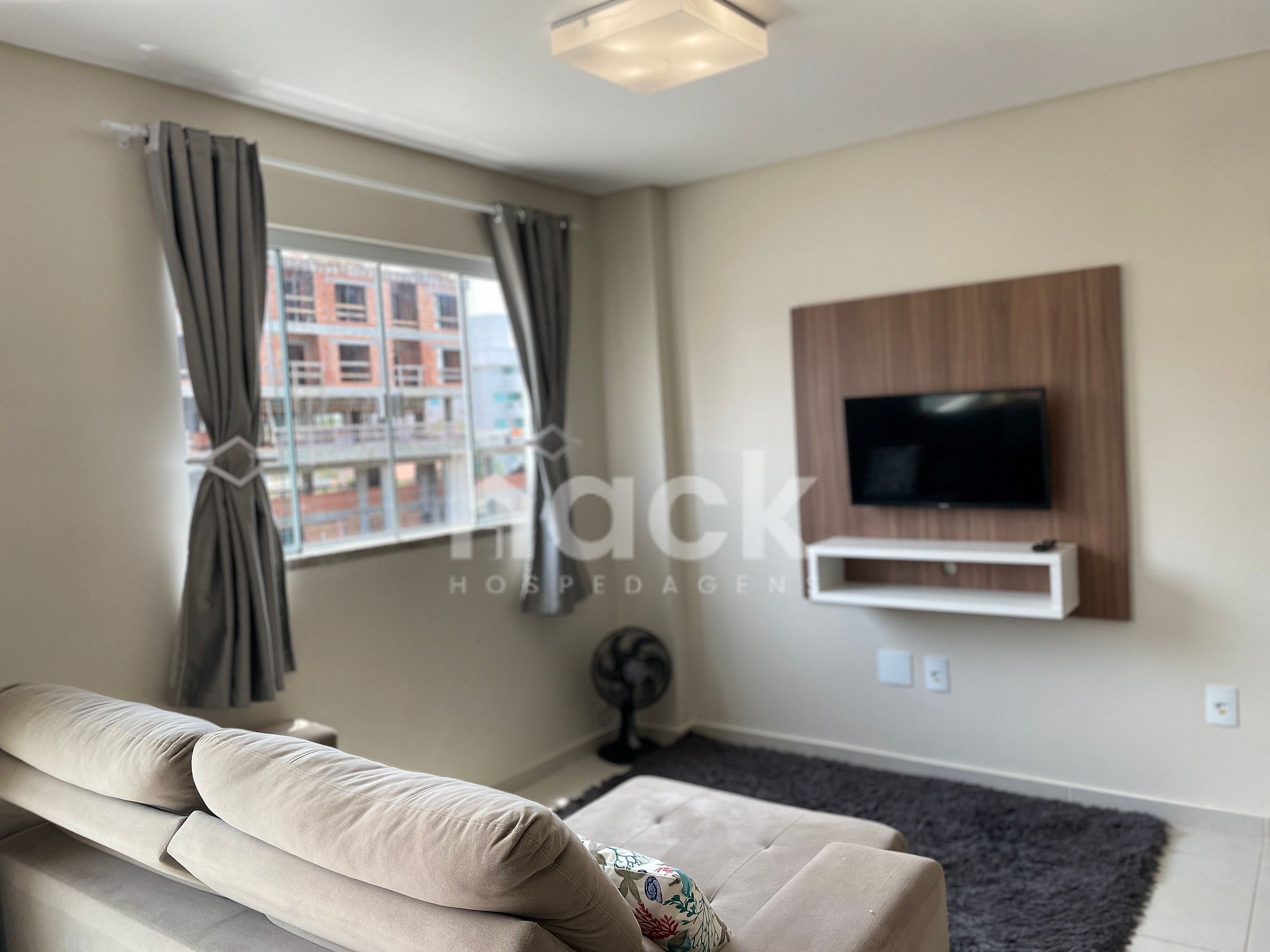 ◘ A sala de estar é integrada com a cozinha, possui uma Smart TV de 43'' e um confortável sofá.