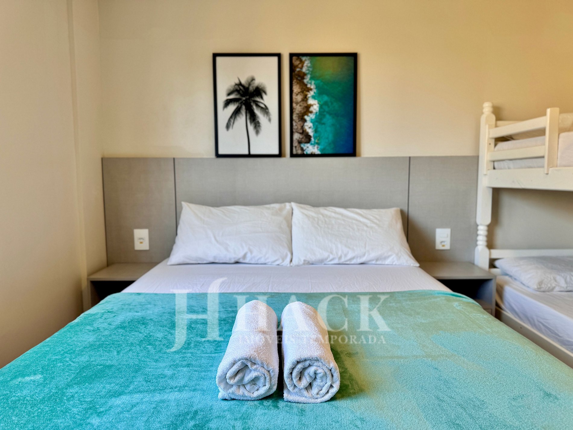 • 1 quarto com 1 cama de casal e 1 beliche + 1 cama de casal auxiliar na sala;