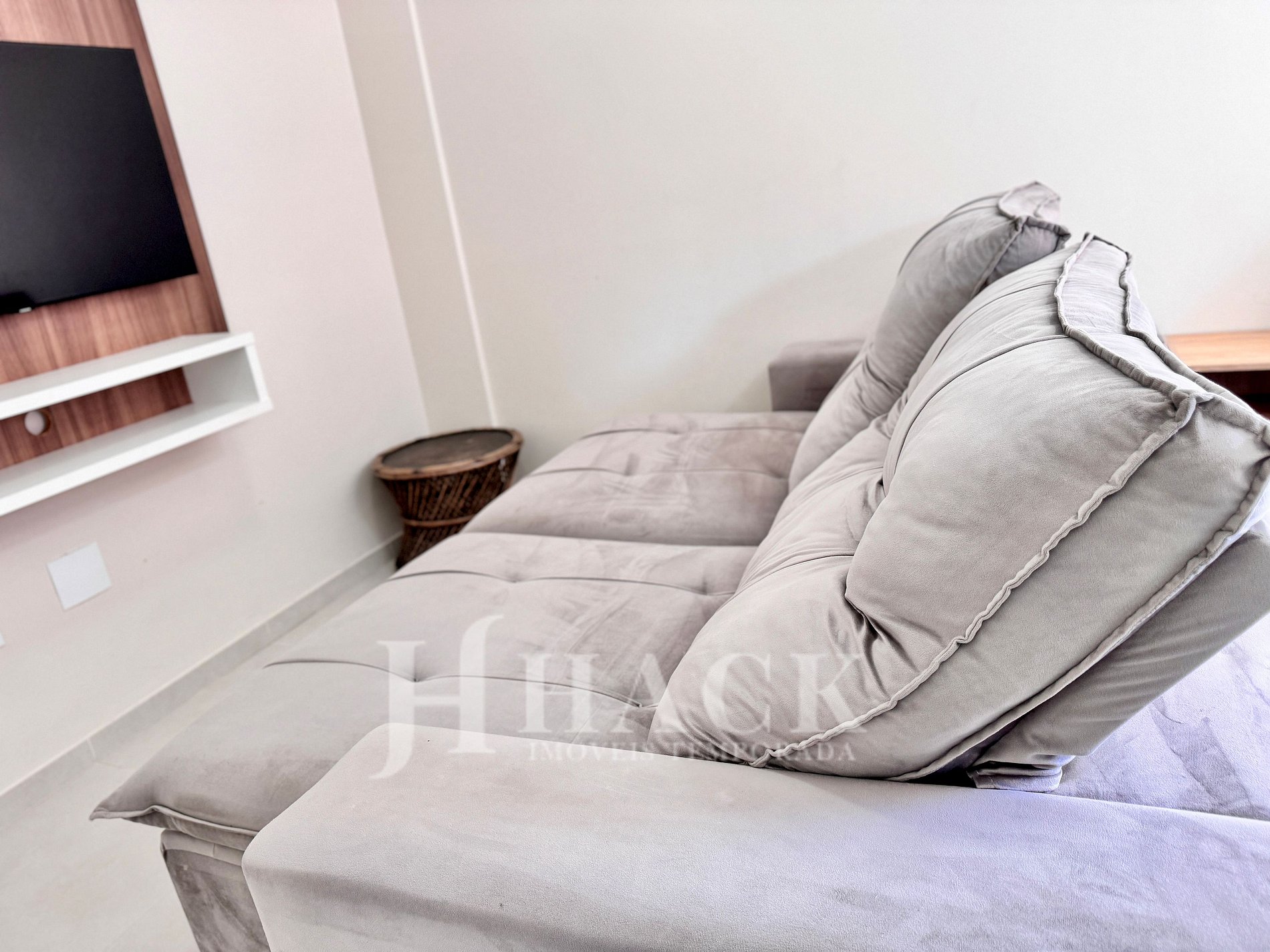 ◘ A sala de estar é integrada com a cozinha e conta com uma cama box de casal, uma Smart TV de 32'' e um confortável sofá.