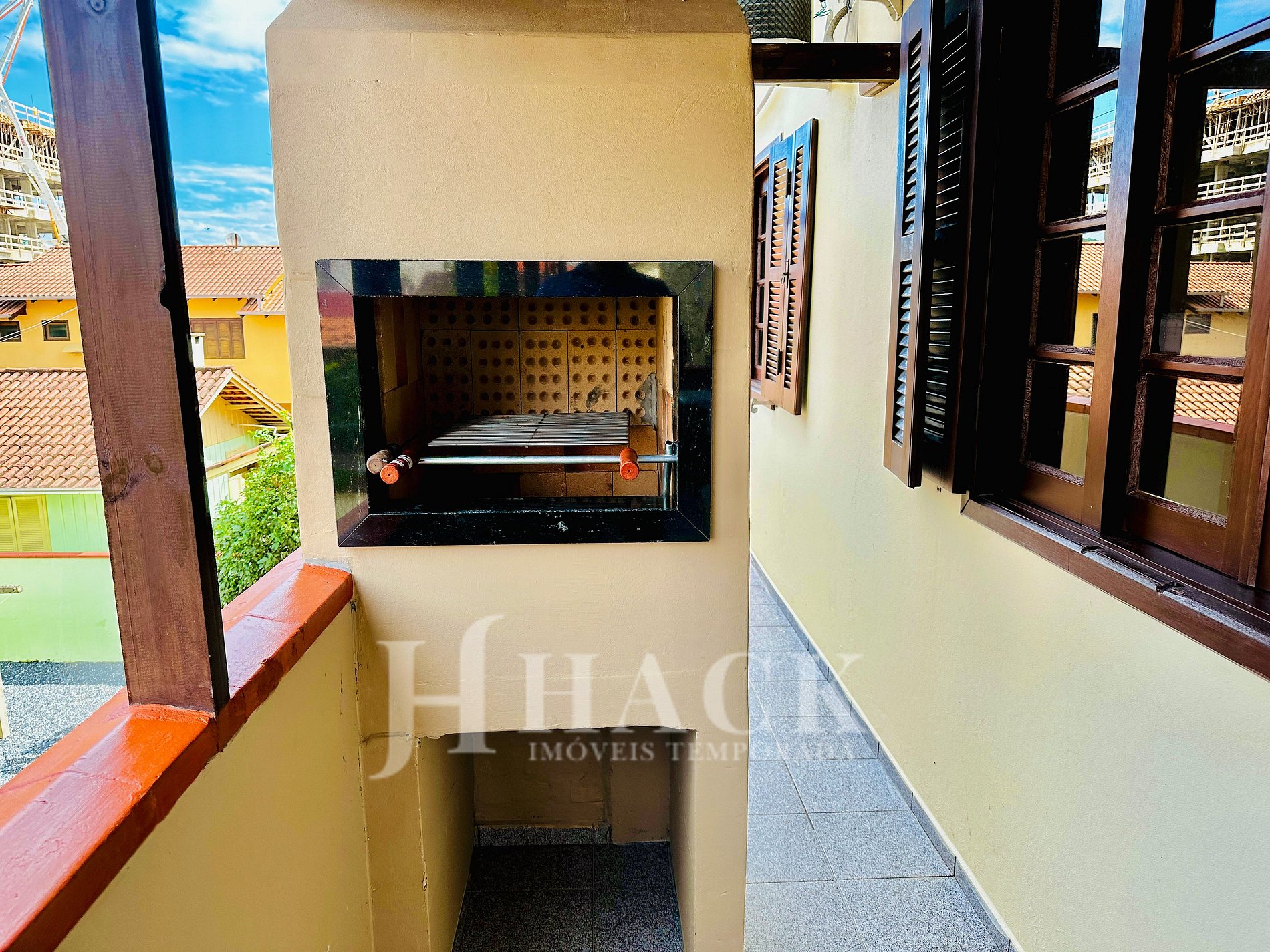 ◘ A churrasqueira à carvão fica integrada com a área de serviço, cozinha e sala de estar.